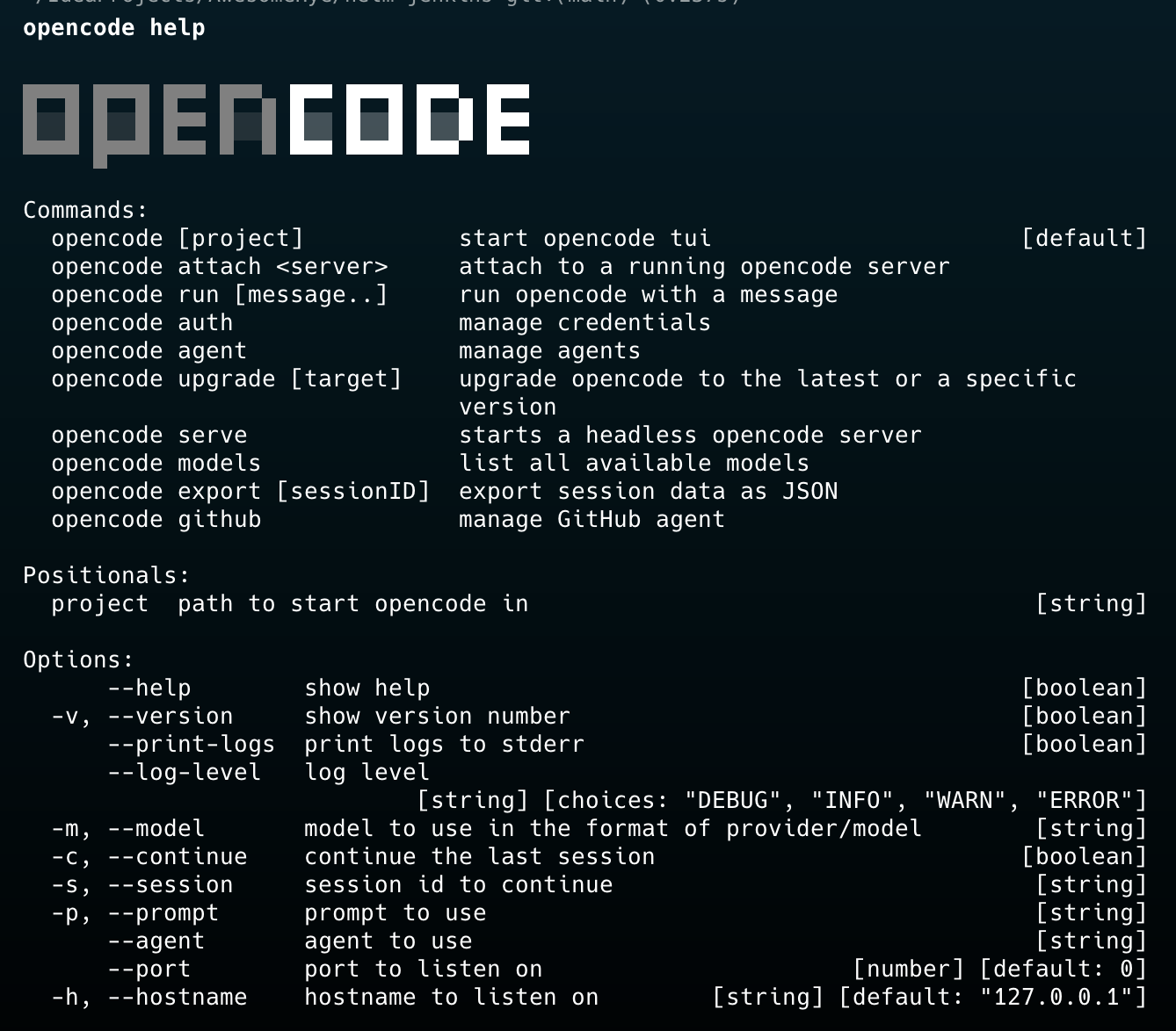 opencode help 커맨드를 통해 CLI 커맨드를 확인할 수 있다.