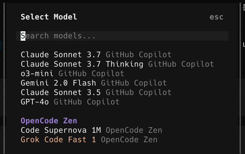 - 로그인한 모델들과 opencode zen의 무료 모델들이 보인다.