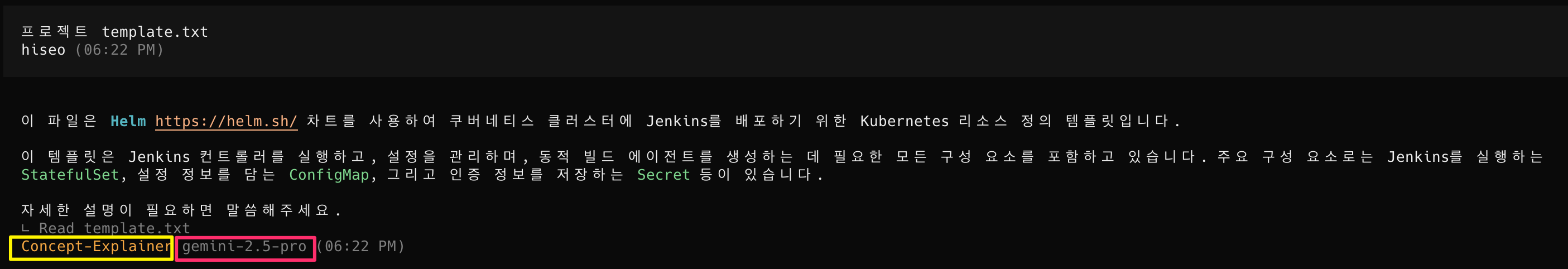 하지만 미리 만들어논 Concept-Explainer agent를 지정한 상태에서 github copilot/Gemini 2.5 pro 모델을 선택하면 에러가 나지도 않고, 간단하게 설명해달라는 Concept-Explainer agent의 말을 잘 듣는 것으로 보아 agent도 적용되는 것 같다.