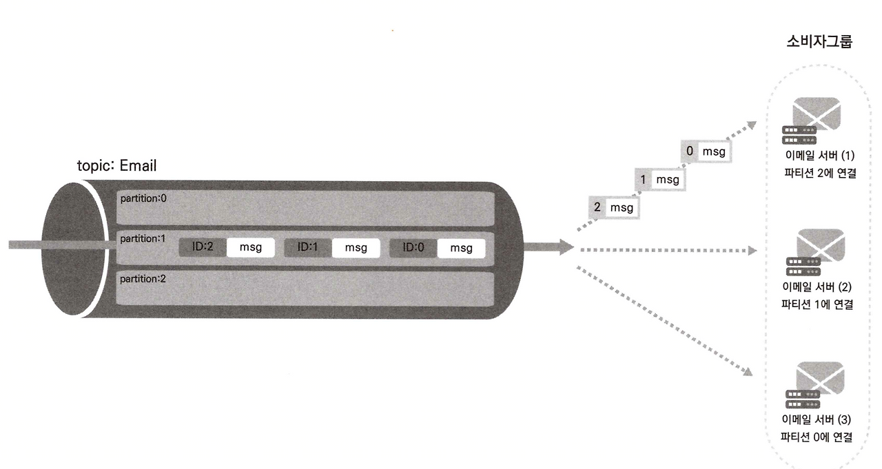- 메시징 큐: 생산자는 소비자의 큐로 직접 push 한다. 같은 메시지를 2개 소비자에게 보내려면 소비자1 큐, 소비자2 큐로 중복 push해줘야한다.