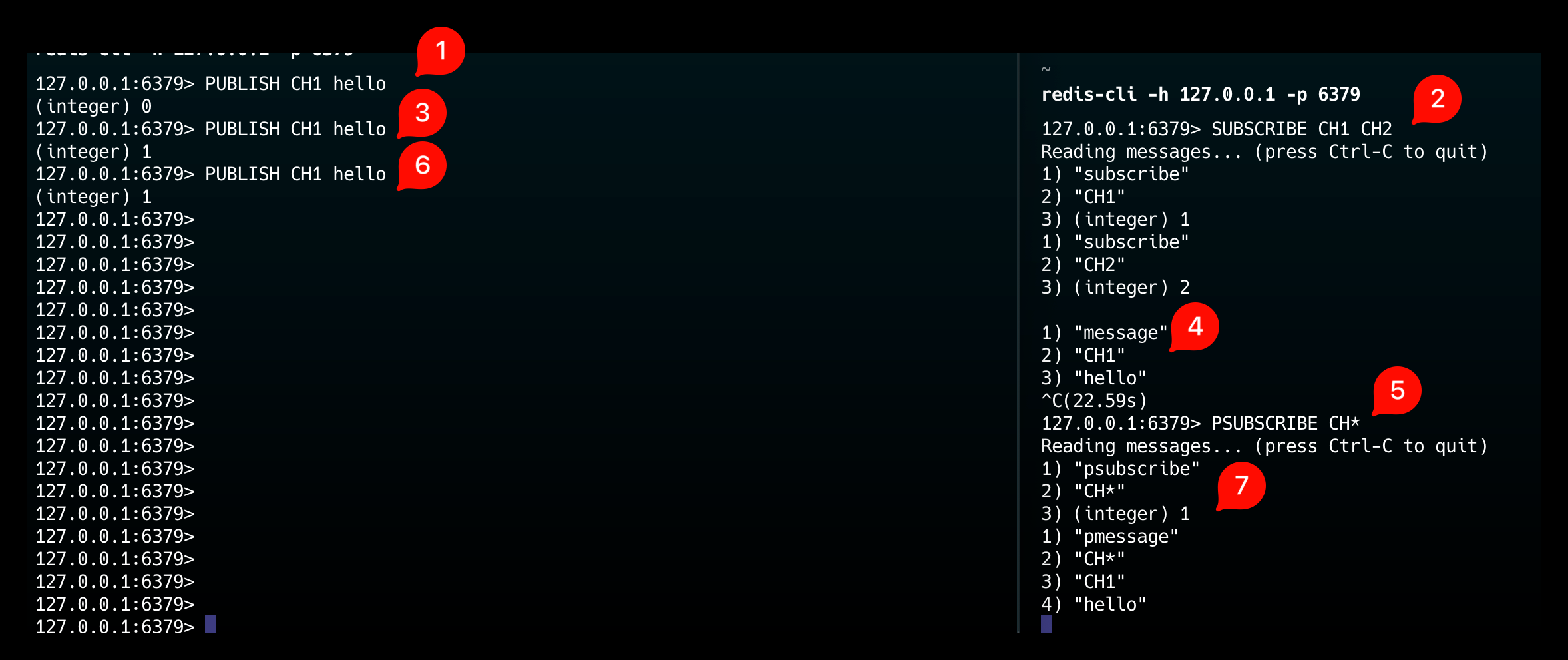 PUBLISH CH1 hello채널(CH1)에 메시지 보내기SUBSCRIBE CH1 CH2채널 2개(CH1, CH2) 구독하기PSUBSCRIBE CH*채널 glob 패턴으로 구독하기.pmessage타입으로 메시지가 온다.- 만약