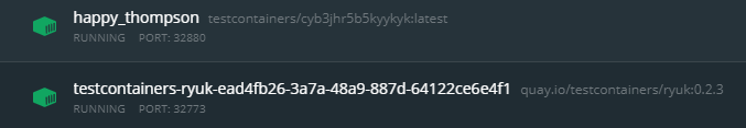 특정 조건일 때 이미지를 지워주는 testcontainers-* 라는 이름의 testcontainers/ryuk 이미지 컨테이너가 먼저 올라가고, 곧바고 랜덤 이름(happy_thompson)의 엘라스틱 이미지가 올라갑니다. 지정된 포트 32880 가 보이시죠?
