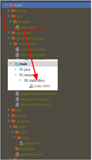 {asciidoctor.outputDir}의 html 를 jar 의 리소스로 엮일 수 있도록build/resources/main/static/docs로 html 파일을 복사한다.