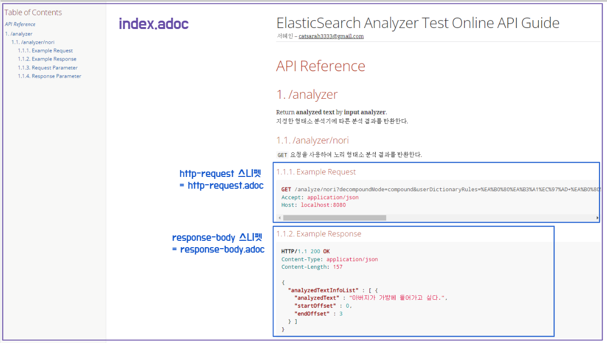 index.adoc 에서 필자의 입맛대로 문서를 작성하며 테스트가 성공하면 생성되는는 스니펫(snippet:토막) 문서를 index.adoc 에 포함시켜 하나의 완성된 문서를 도출하는 구조이다.