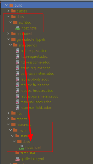 ${asciidoctor.outputDir}에 생성한다. 이 파일을 로컬에서 실행 시http:localhost:8080/docs/index.html로 접근할 수 있도록 html 파일을 복사한다. ${asciidoctor.outputDir}의 디폴트 경로는 필자같은 경우는build\docs\asciidoc이다. 공식 문서와 경로가 다르니 각자 확인해보자