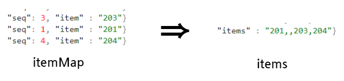 items 필드에는 seq 순서대로 item 값을 담아야 한다. 그래서 기존 itemMap 은 seq 값까지 파일 구조 그대로 메모리에 모두 담은 뒤에 몽고DB 에 삽입하기 직전에 items 만들기 연산 (seq 순서대로 item 값을 이어붙이기) 을 수행하고 삽입하는 방식이었다.