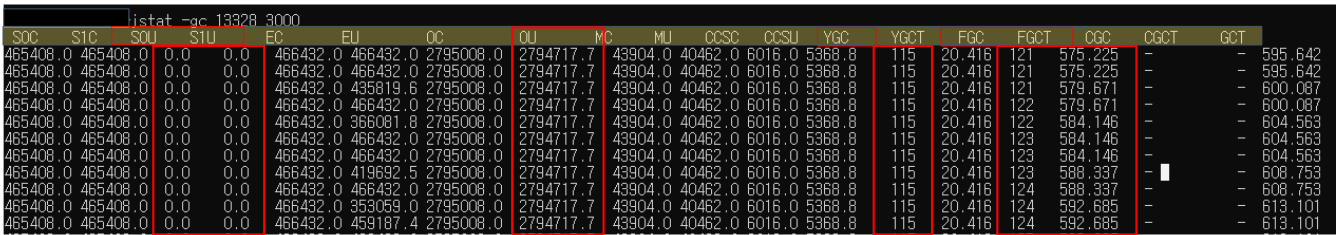 힙 메모리의 상황을 스냅샷처럼 찍어 3초마다 한 라인씩 출력한다. 내가 발견한 이상한 점은 아래와 같았다.