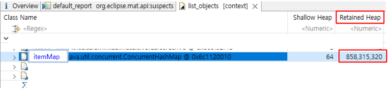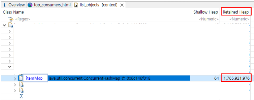 itemMap 이 눈에 튀게 다른 인스턴스 변수보다 1.7GB나 잡고 있었다. itemMap은 idx 키 값으로 엮여있는 Nested HashMap 구조이다.