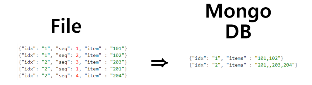 File To MongoDB 애플리케이션을 개발해야 한다. raw 파일 데이터에서 “idx” 필드를 KEY 로 잡아 그룹핑 후 “seq” 순으로 “item”값을 연속으로 붙여 MonoDB 에 적재하는 작업이다.
