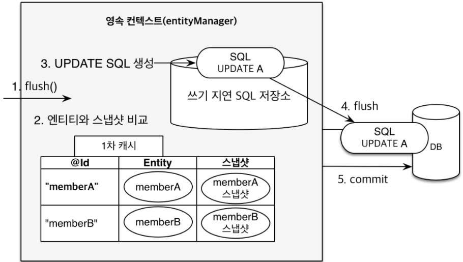 - JPA는 엔티티가 변경된다고 해서 바로바로 DB에 반영되는게 아니라 변경 사항을 영속성 컨텍스트에 저장한다.