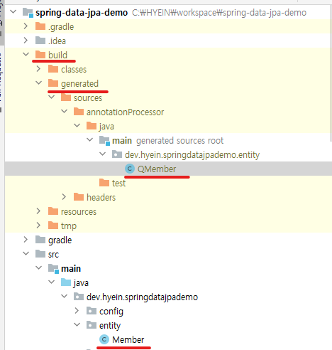 Build and run using 을 Gradle 로 설정하면 Q 클래스 파일은build/generated 에 생성되고,