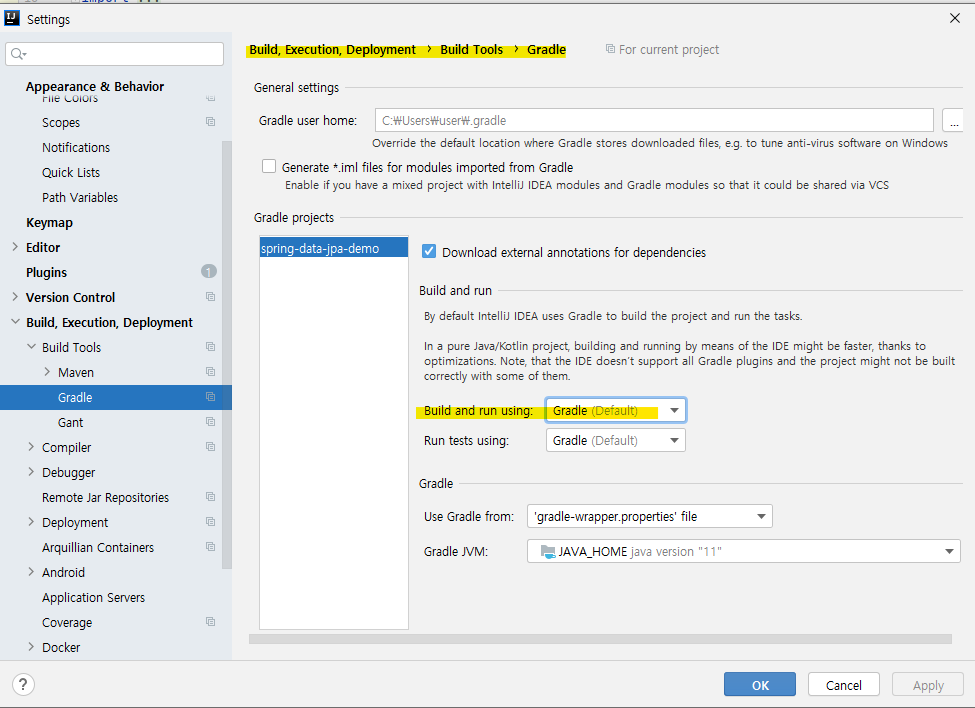 Intelij settings 의 Build, Execution, Deployment > Build Tools > Gradle 에서 빌드와 실행을 Gradle 로 할 건지, Intelij 로 할 건지 선택할 수 있다.