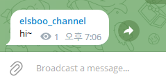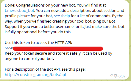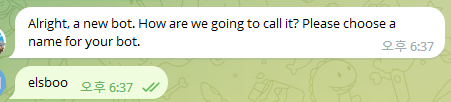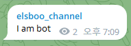 자 이제 봇의 토큰을 얻었다. elsboo_bot은 이 토큰을 통해 메시지를 송신할 수 있다.