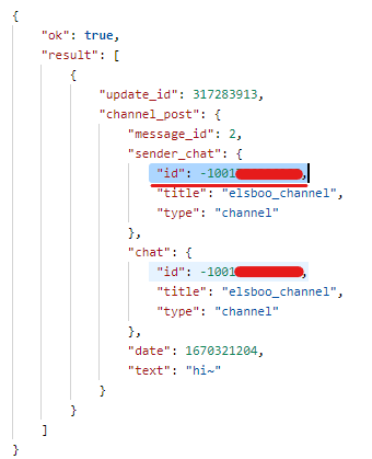 먼저 채널에 아무 메시지나 보내고, /getUpdates 를 통해 채널 정보를 얻어오면 채널 ID를 알 수 있다.