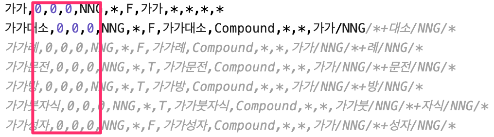 이 값들은 mecab-ko-dic 사전에서 찾을 수 있다.