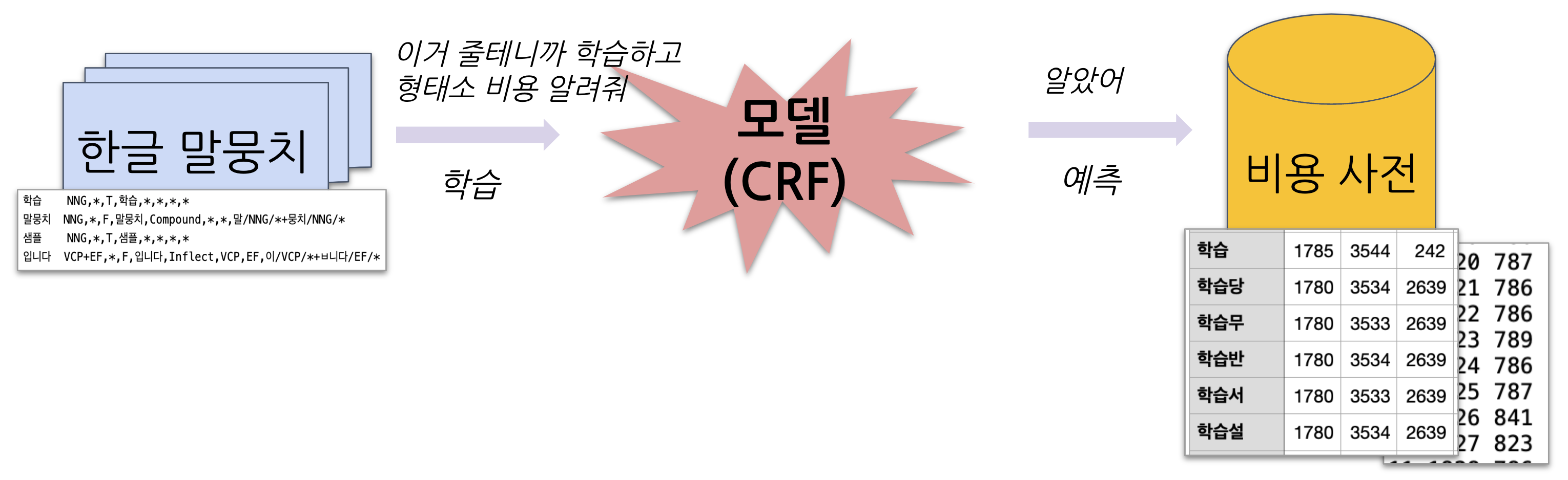 형태소 분석이 잘 되어있는 거대한 말뭉치를 정답셋으로 던져주면, CRF 가 학습한 후에 단어 비용과 연결 비용을 예측해 우리에게 결과물로 던져준다.