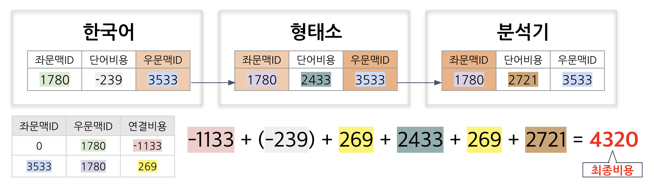 최종비용 = [문장처음+한국어] 연결비용 + [한국어] 단어비용 +