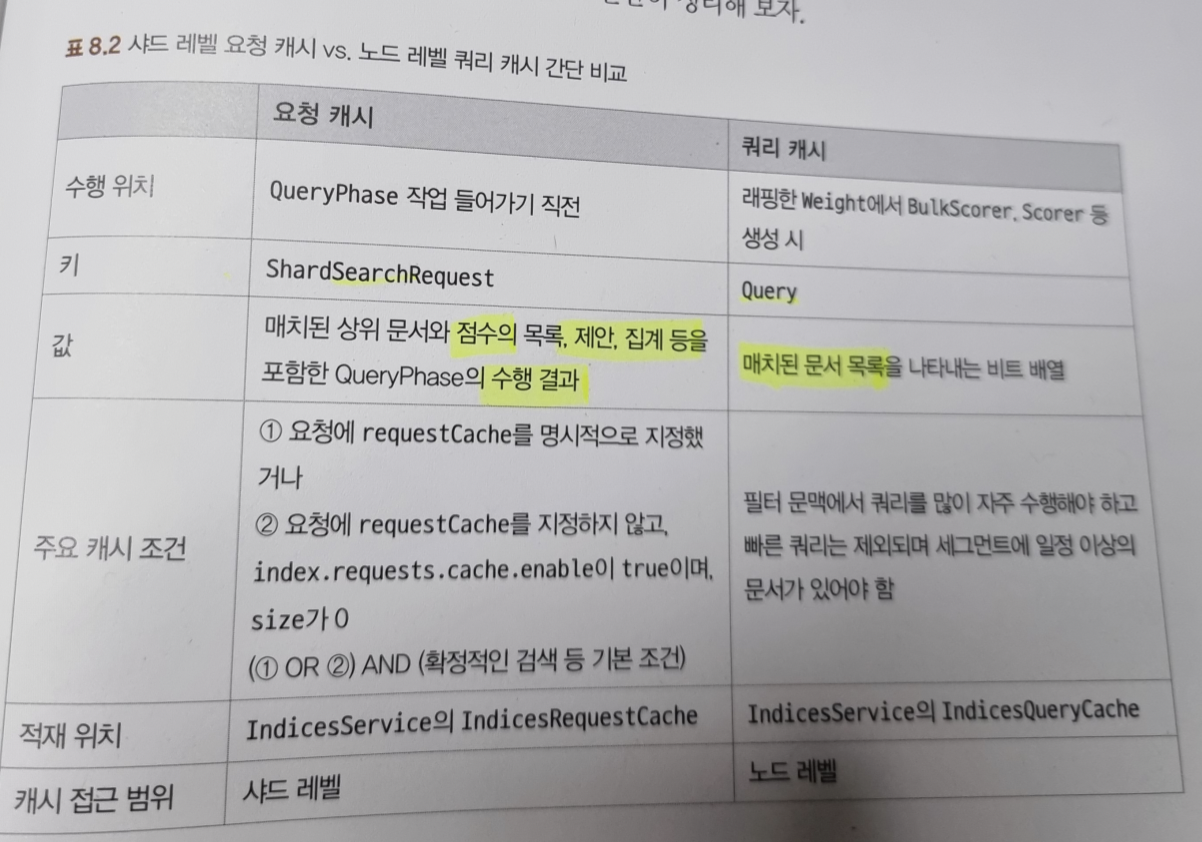 -캐시 없어도 충분히 빠를 쿼리는 캐시 하지 않음 (TermQuery, MatchAllDocQuery, MatchNoDocsQuery, DocValuesFieldExistQuery(doc_values 필드 대상 exists 쿼리) ..)