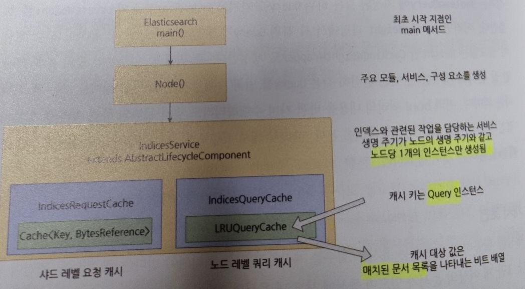 -ES 노드 기동되면 Node 클래스 생성자 호출 → IndicesService 인스턴스가 생성 → IndicesRequestCache 인스턴스를 생성 → Cache 생성 => 이 Cache 인스턴스에 샤드 레벨 요청 캐시가 적재됨