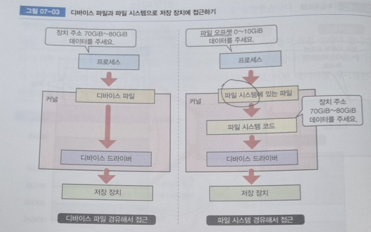 대부분 저장장치는 디바이스 파일이 아니라 파일 시스템으로 접근한다.