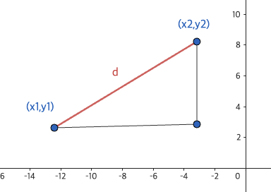 두 점 $(x_1,x_2), (y_1,y_2)$ 를 삼각형으로 표현한 후 두 점 사이의 거리 d 를 구하려면 피타고라스의 정리를 사용한다.
