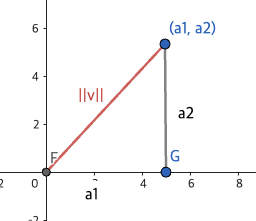 벡터 $v = (a_1, a_2)$ 일 때, (0, 0) 에서 $(a_1, a_2)$ 까지의 거리는 피타고라스의 정리를 이용하면 다음과 같다.