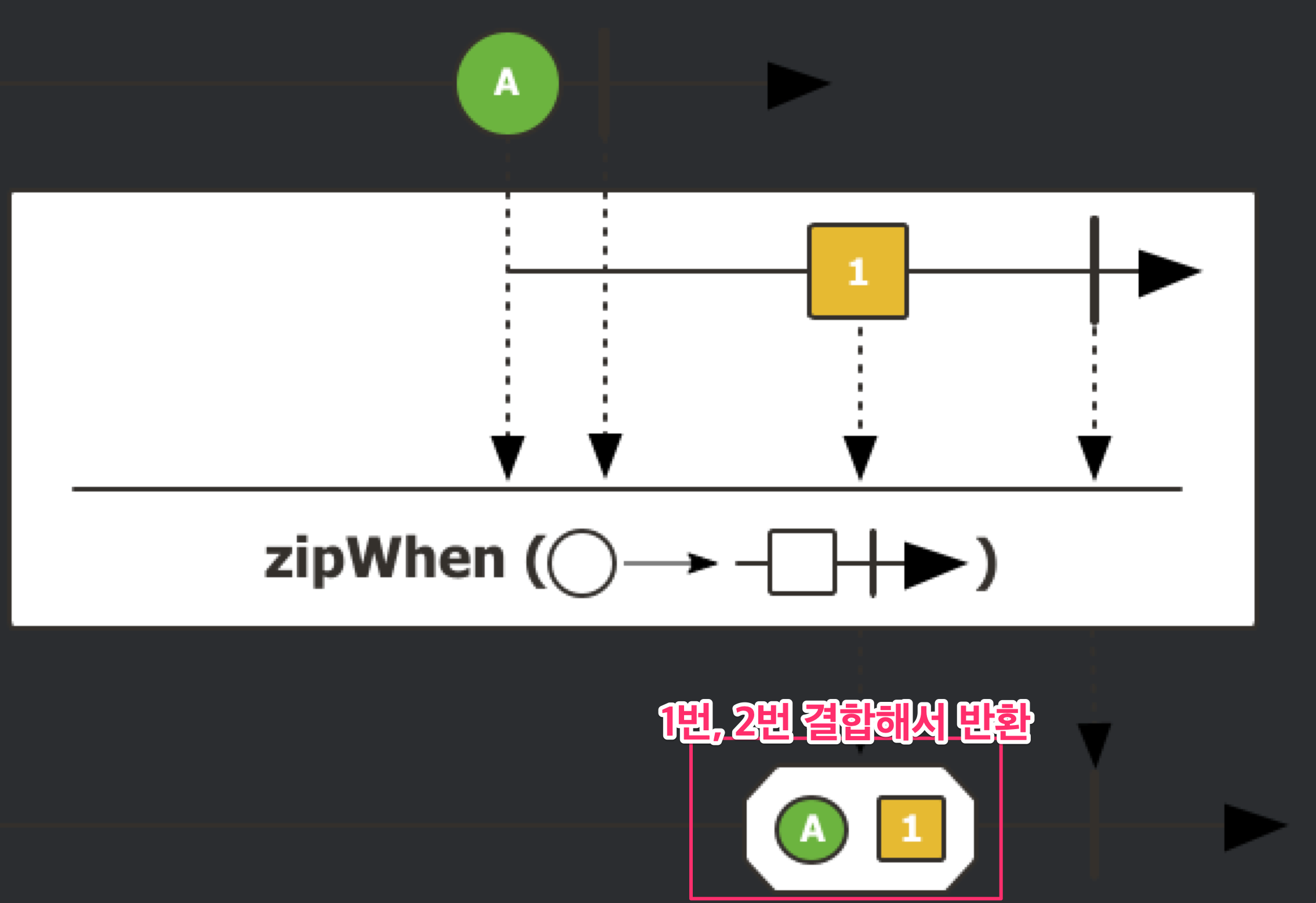 마블 다이어그램으로도 비교해보면 zipWhen 은 첫 번째, 두번 째 결과를 결합해 반환하지만 flatMap 은 마지막 결과만 반환하는 걸 확인할 수 있다.